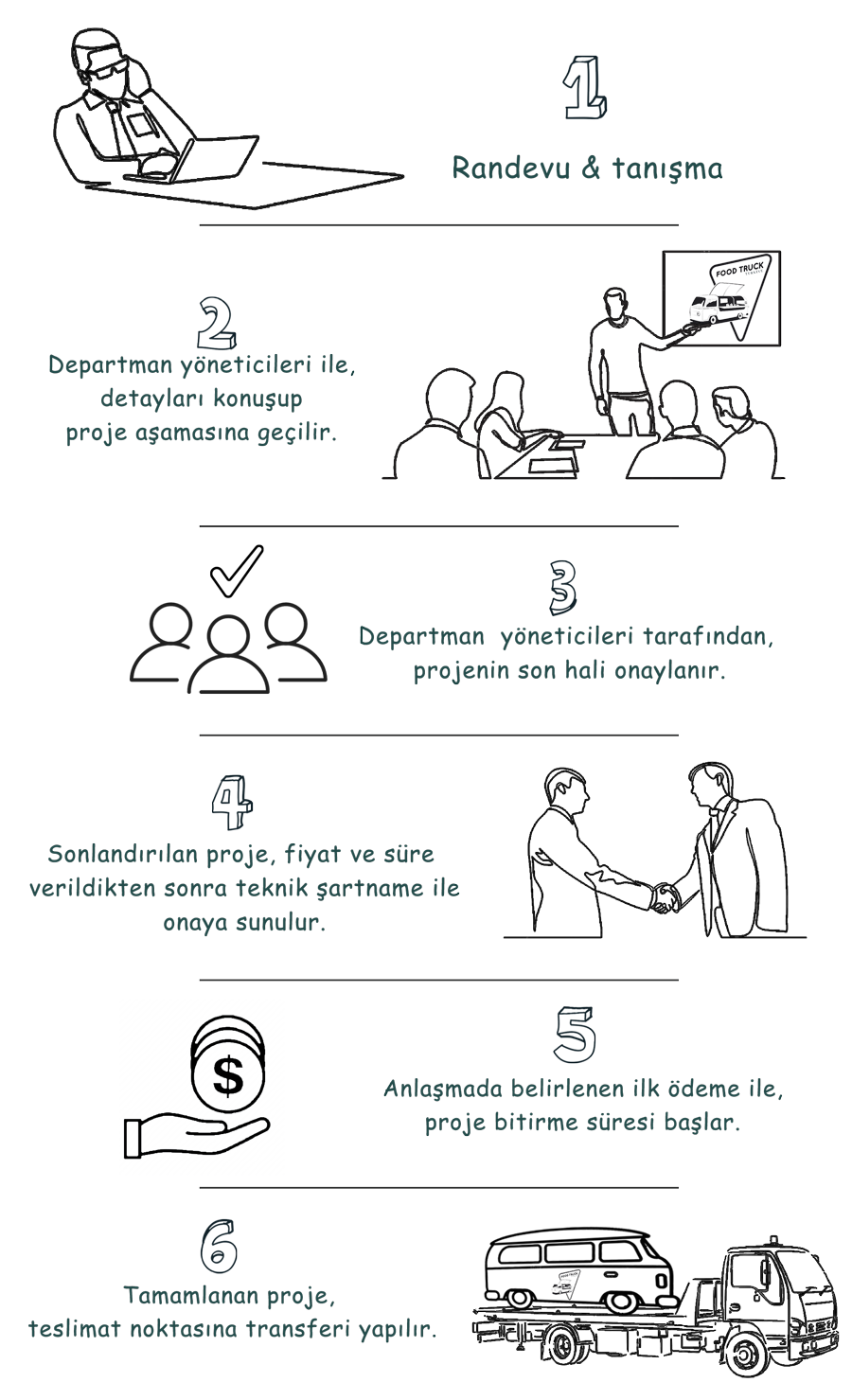 Food Truck Türkiye olarak otel, avm, fuar alanları için, mobil yiyecek – içecek araçları tasarlayıp üretiyoruz.